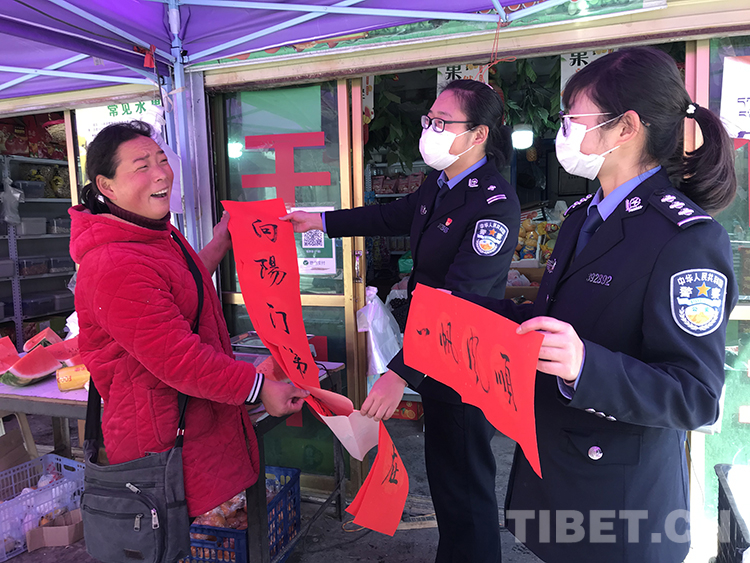 2月7日,拉薩邊檢站邀請拉薩市文聯(lián)書法家協(xié)會(huì)共同開展“同心同書——祖國新春好”送萬福進(jìn)萬家活動(dòng)。4名書法家揮毫潑墨,書寫漢文藏文春聯(lián),散發(fā)著墨香的春聯(lián)凝聚著無限的祝福。隨后,邊檢站格?;ㄅ訄?zhí)勤隊(duì)民警為駐地商戶送“?!彼痛郝?lián)。在駐地的一家超市,商戶張大姐興高采烈地與民警一邊貼春聯(lián),一邊笑著說:“感謝你們送來的新春祝福。今年雖然沒能回家過年,但有你們的陪伴照顧,我們感到很開心?!?/p>