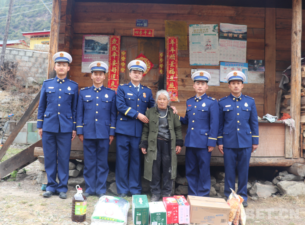 伴隨著冬日里溫暖的陽光,中隊指戰(zhàn)員代表帶著慰問品和節(jié)日的祝福來到了卓給阿媽家中,阿媽高興地迎接大家。指戰(zhàn)員們?yōu)榘審堎N對聯(lián)、整理衣物、收拾衛(wèi)生,給阿媽測量血壓,與阿媽拉家常,小屋沉浸在溫馨祥和的氛圍中。阿媽拉著指戰(zhàn)員的手說道:“謝謝你們經(jīng)常來看我,我雖然沒有兒女,有你們的掛念,心里很滿足。”臨走時,指戰(zhàn)員再三叮囑阿媽有困難一定要及時聯(lián)系,她的“兒子”會經(jīng)常來看望。
