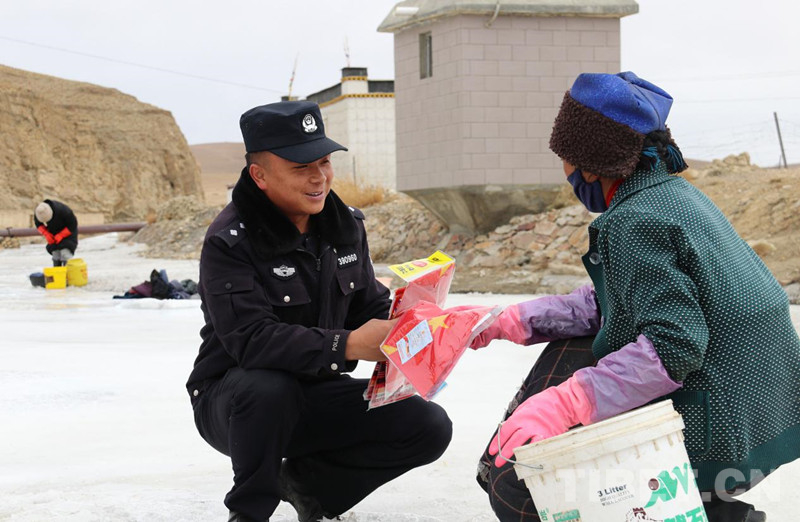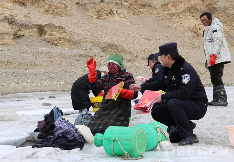 在群眾家里、街道上、冰河上,直克鄉(xiāng)邊境派出所民警向群眾送出了一面面嶄新的國(guó)旗,鮮紅的國(guó)旗映紅了每個(gè)人的臉龐,將揚(yáng)帆啟航新征程的祈愿深入每個(gè)人的心中。直克鄉(xiāng)索白村退伍老兵朗加激動(dòng)地說(shuō):“國(guó)旗是祖國(guó)的象征和標(biāo)志,需要共同守護(hù)。在雪域高原上,你們戰(zhàn)嚴(yán)寒、耐寂寞,披星戴月、頂風(fēng)踏雪,燃起了警民‘共話護(hù)邊’的愛(ài)國(guó)熱情,謝謝你們用實(shí)際行動(dòng)溫暖著我們?!?/p>
