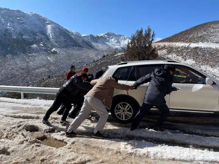 面對焦急萬分的父親,為了讓病中的孩子第一時間得到醫(yī)治,根秋降澤立即下車施救。由于鄉(xiāng)村道路路況較差,加之冰雪覆蓋,車輛打滑嚴重,施救過程十分艱難。根秋降澤憑借多年應對冰雪路況的駕駛經(jīng)驗,組織大家在極度嚴寒、工具缺乏的情況下,通過刨冰除雪、手推車拉的方式,經(jīng)過半個多小時的努力終于讓被困車輛擺脫困境。根秋降澤捂著凍僵的手,一再提醒駕駛員要常備防滑鏈條,在冰雪路段需小心謹慎駕駛,切勿急打方向等注意事項。