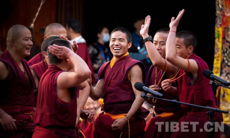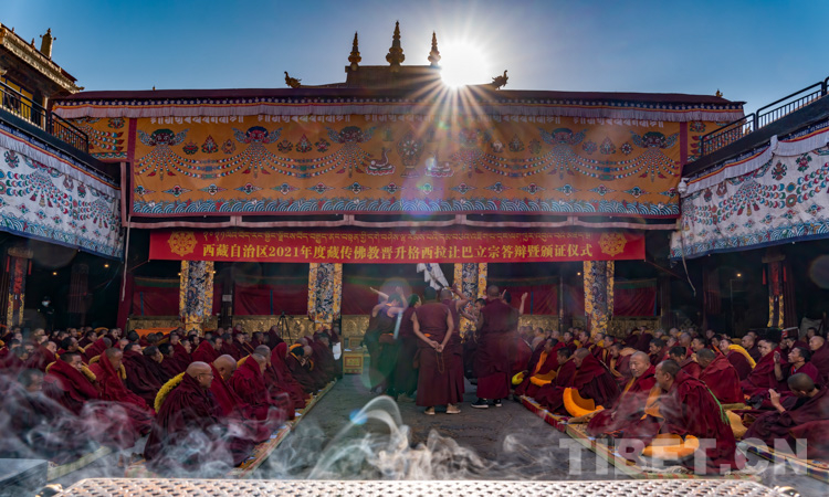 圖為西藏自治區(qū)2021年度藏傳佛教學(xué)經(jīng)僧人考核晉升格西拉讓巴學(xué)位立宗答辯暨頒證儀式現(xiàn)場 攝影:趙耀