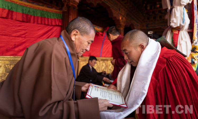 圖為中國佛教協(xié)會西藏分會常務(wù)副會長珠康·土登克珠活佛(左)向考僧頒發(fā)學(xué)位證書 攝影:趙耀