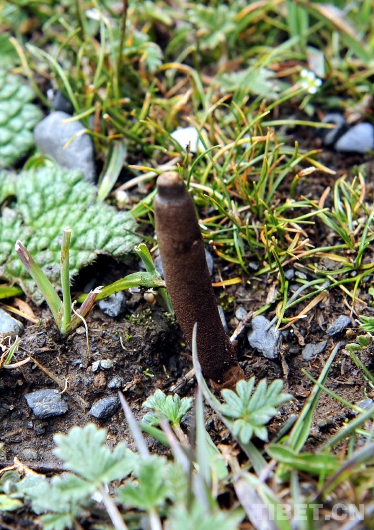 圖為藏北比如縣薩普冰川下的草地上,一根露出地表的蟲草棒頭,其棒頭下面的土里是連著的蟲子(唐召明2014年7月10日攝)