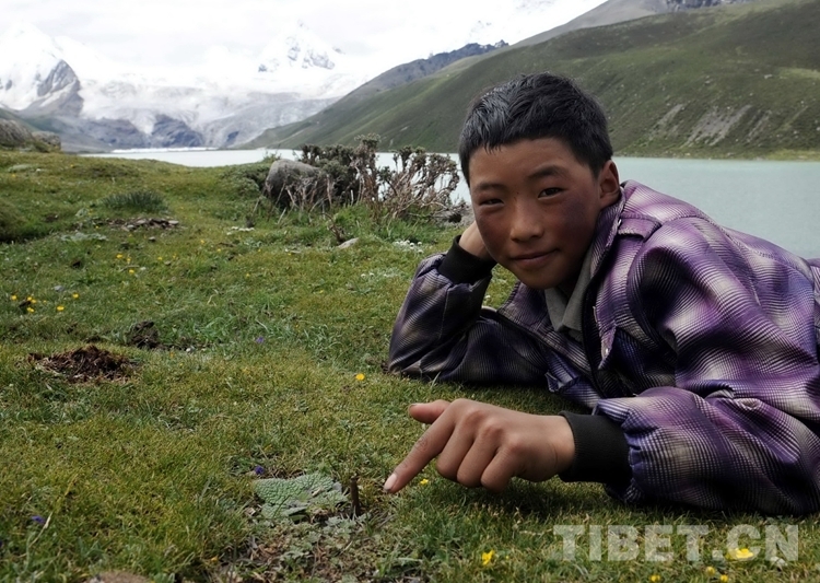 圖為一名牧家大男孩手指藏北比如縣薩普冰川下的草地上生長(zhǎng)的一根蟲草(唐召明2014年7月10日攝)