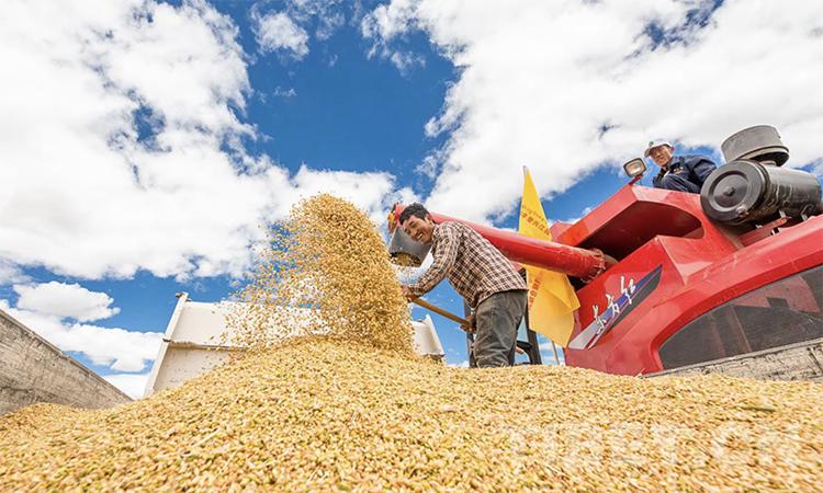 圖為日喀則市江孜縣青稞機(jī)械化收割現(xiàn)場 攝影:趙耀