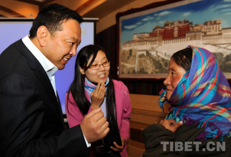 這是時(shí)任班戈縣縣委書(shū)記巴塔(左)與該縣脖子下切除巨大腫瘤、剛從北京治療回來(lái)的牧女斯求卓瑪交談(唐召明2011年8月16日攝)