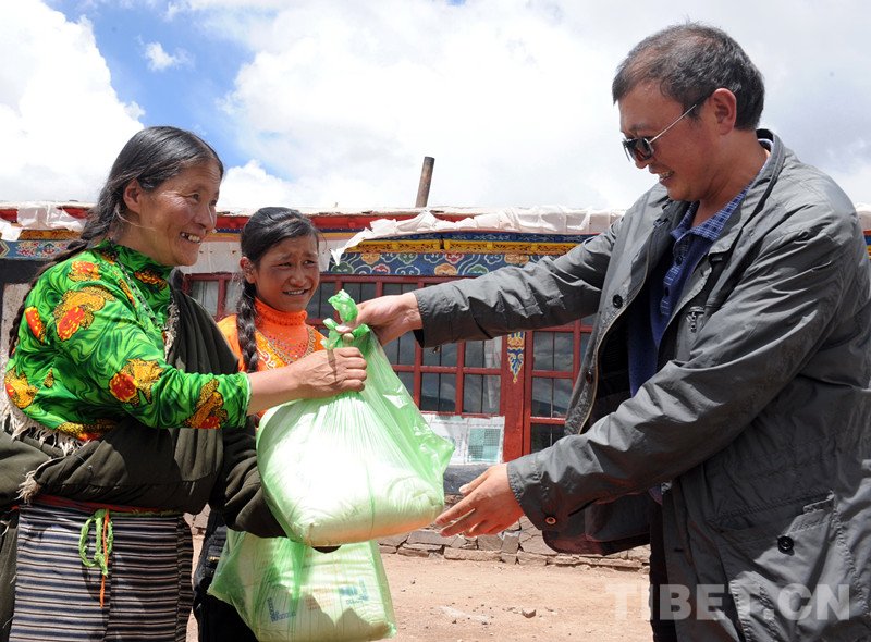 這是時(shí)任班戈縣副縣長(zhǎng)的李正斌看望曾罹患巨大腫瘤的牧女斯求卓瑪,為她送去糧油等慰問(wèn)品(唐召明2012年8月3日攝)