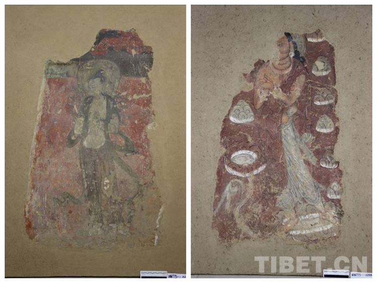 圖為修復后的表層壁畫(左)和修復后的底層壁畫(右)。原藏于甘肅武威天梯山石窟第 4 窟中心柱,現為武威市天梯山石窟保護研究所藏