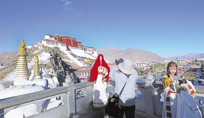 圖為游客在布達(dá)拉宮前拍照留念。記者 格桑倫珠 攝 圖片來源:西藏日?qǐng)?bào)
