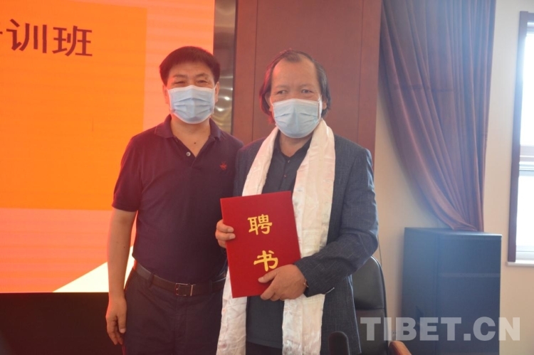 圖為仲格嘉向明珠同志頒發(fā)聘書,聘請明珠為北京藏醫(yī)院藏藥浴專題培訓(xùn)班授課老師