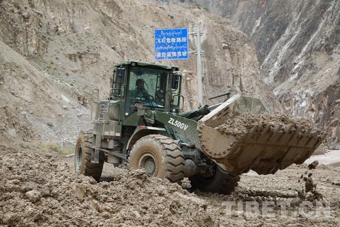 圖為該支隊(duì)救援官兵正在對(duì)川藏線怒江溝泥石流災(zāi)害進(jìn)行搶通