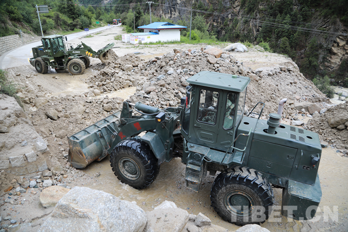 圖為該支隊(duì)救援官兵正在對(duì)川藏線玉普鄉(xiāng)境內(nèi)泥石流進(jìn)行清理