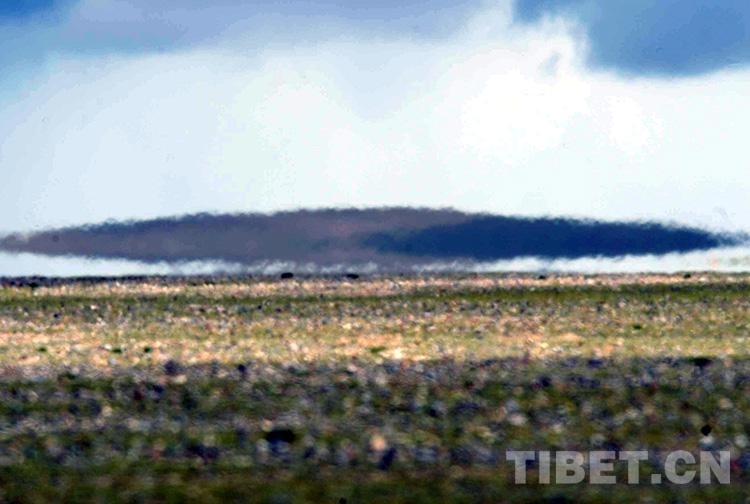 圖為出現(xiàn)在藏北無(wú)人區(qū)的形似飛碟的海市蜃樓。海市蜃樓是因空氣中不斷升騰的水汽將光線折射而形成(唐召明2009年8月2日攝)