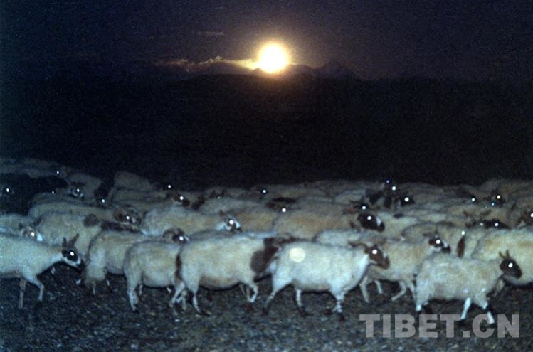 圖為夜幕下牧歸的羊群。它們的眼睛在夜里所發(fā)出的光,猶如“草原燈火”(唐召明1988年攝)
