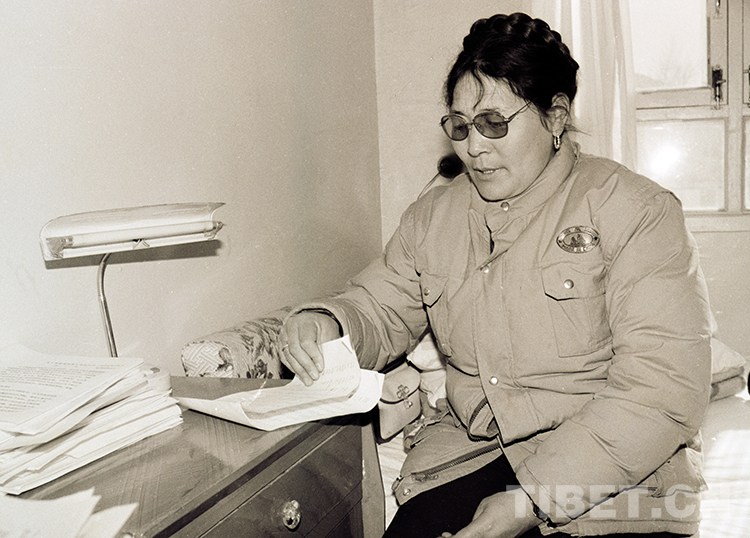 1987年,時任那曲地區(qū)(現(xiàn)那曲市)行署副專員的次仁玉珍在拉薩參加西藏“兩會”時,在駐地房間準(zhǔn)備上會提案(唐召明1987年攝)