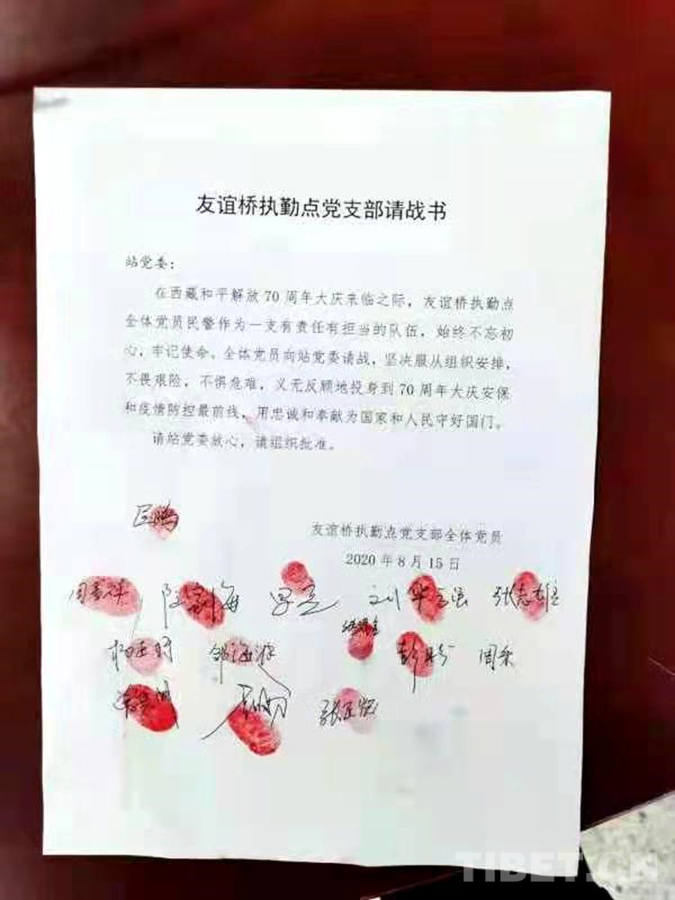 8月15日,聶拉木出入境邊防檢查站友誼橋執(zhí)勤點18名黨員民警在接受抗疫命令后,18名隊員在界碑前列隊,舉起右拳,鄭重宣誓,踴躍請戰(zhàn)?!霸谝咔榉揽毓ぷ髦?,我自愿申請參與到國門一線的疫情防控工作,到口岸一線去,這是我的職責和使命……”剛分配到單位的新警李東洪在請戰(zhàn)書中寫道。