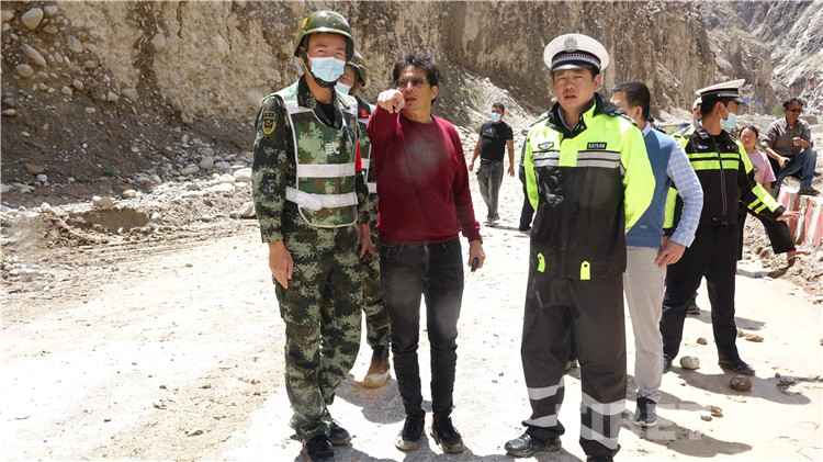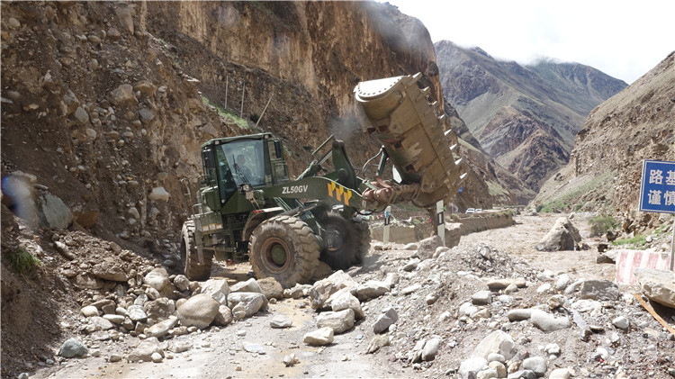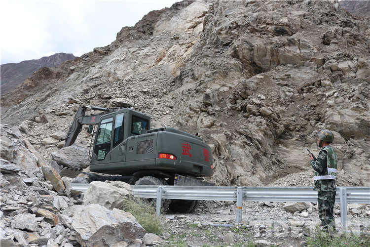 抵達現(xiàn)場后,武警官兵及時對災(zāi)害路段實施交通管制,并把滯留車輛疏導(dǎo)至安全區(qū)域,隨即對泥石流堆積物和塌方體進行清理。因災(zāi)害點處于峽谷地帶,地勢十分險要,作業(yè)面狹窄,且降雨及落石持續(xù)不斷,為確保搶通工作高效安全,指揮員科學(xué)指揮,安全員高度警惕,操作手快速搶通,各要素密切配合,給道路搶通工作爭取了寶貴時間。
