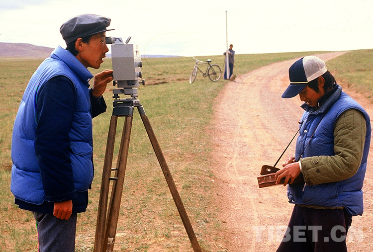 這是國(guó)家測(cè)繪局第一大地測(cè)量隊(duì)技術(shù)人員在進(jìn)行大地水準(zhǔn)測(cè)量(唐召明1987年攝)
