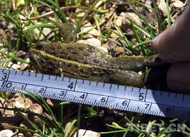 這是藏北無(wú)人區(qū)科考團(tuán)科考人員在給申扎縣雄梅鄉(xiāng)所發(fā)現(xiàn)的高山蛙量體長(zhǎng)。這種高山蛙的新發(fā)現(xiàn),填補(bǔ)了我國(guó)高海拔地區(qū)沒(méi)有蛙類(lèi)生存的空白(唐召明2001年攝)