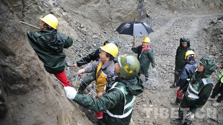 圖為該支隊(duì)官兵正對(duì)山體巖石進(jìn)行破碎