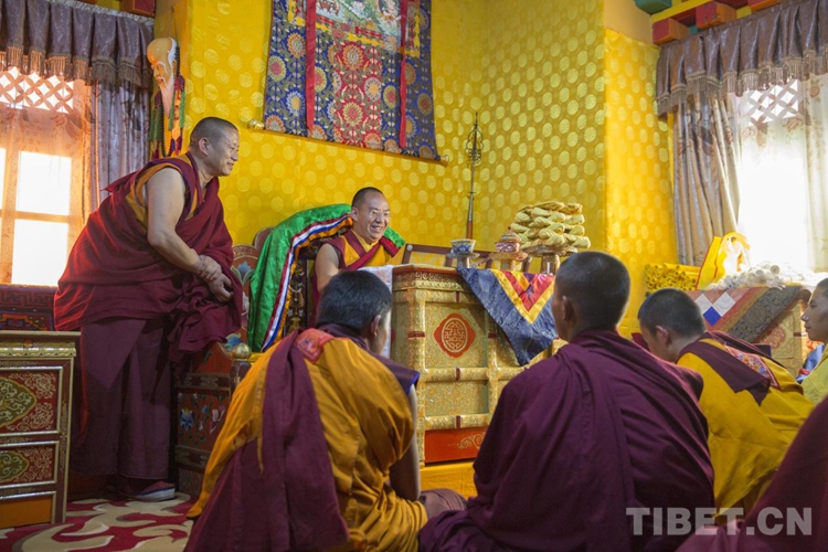 班禪講經(jīng)、禮佛后,在納塘寺主殿二樓一間經(jīng)堂內(nèi)特意現(xiàn)場(chǎng)抽查測(cè)試了年輕僧人對(duì)佛經(jīng)的背誦學(xué)習(xí)情況,聽取四批僧人背誦經(jīng)文,并隨機(jī)提問。聽到僧人們對(duì)答如流,班禪頻頻點(diǎn)頭、微笑肯定。