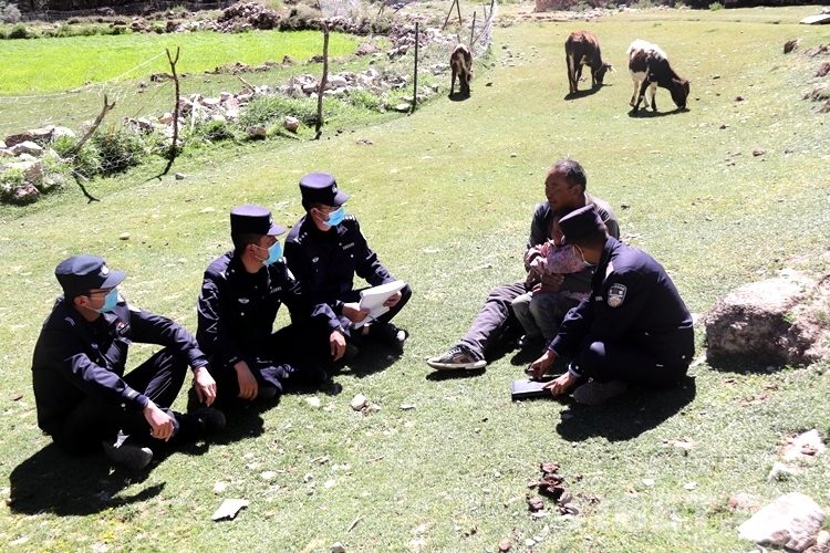 圖為雷曉虎和其美多吉在單位民警的配合下前往放牧區(qū)采集身份證辦理信息