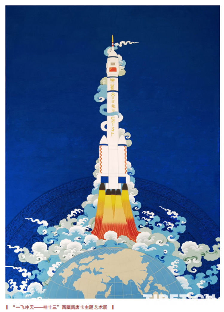 唐卡藝術(shù)家邊巴的新唐卡作品《一飛沖天》,以神舟十三號(hào)為主題,描繪了飛船沖出地球奔向星辰大海的瞬間。飛船、地球、祥云的后面,有一個(gè)融入背景的曼荼羅圖案,象征著西藏傳統(tǒng)的宇宙觀。傳統(tǒng)地道的勉唐派唐卡繪畫語(yǔ)言,采自天然礦物富有環(huán)保特征的厚實(shí)顏色,漢藏融合的審美品位,立足中國(guó)放眼世界的人類命運(yùn)共同體胸懷,正是新時(shí)代新唐卡新融合的藝術(shù)表達(dá)。