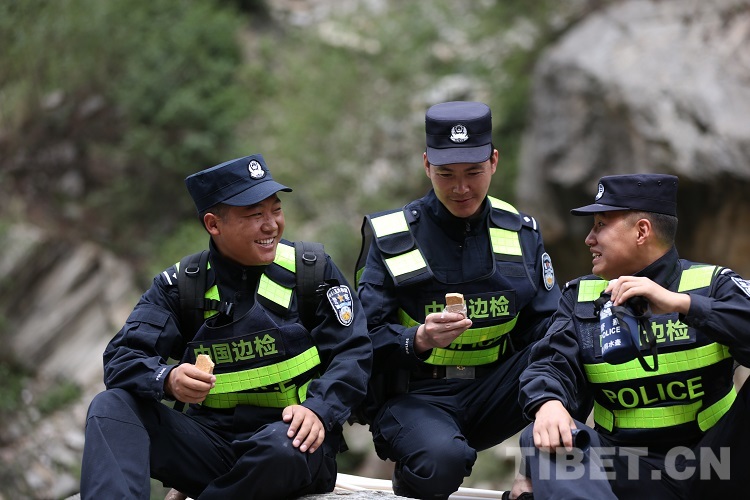 圖為聶拉木出入境邊防檢查站友誼橋執(zhí)勤點民警在巡邏休息的時候吃壓縮餅干 攝影:尼瑪?shù)┰?/p>