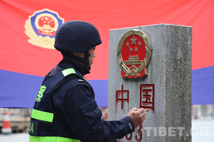 圖為友誼橋執(zhí)勤點(diǎn)民警歐珠次仁在警察節(jié)來臨之際為界碑描紅