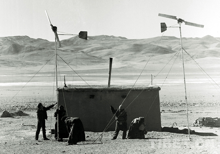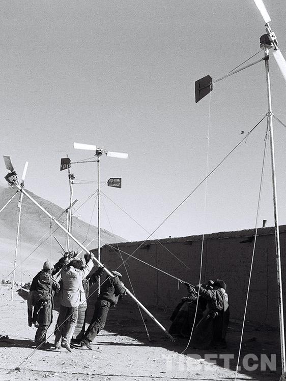 這是那曲地區(qū)風(fēng)能試驗(yàn)站技術(shù)人員正在豎起剛為那曲地區(qū)雙湖辦事處(現(xiàn)那曲市雙湖縣)嘎措鄉(xiāng)所檢修保養(yǎng)的風(fēng)力發(fā)電機(jī)(唐召明1988年攝)