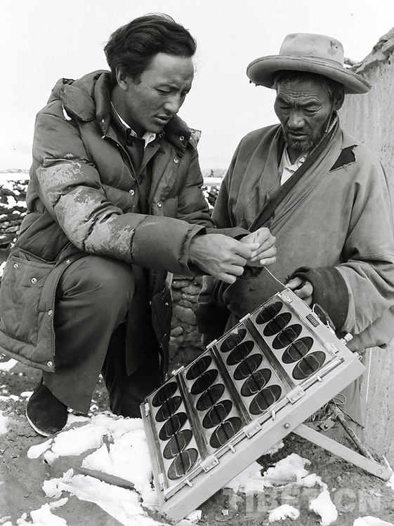 這是那曲地區(qū)風(fēng)能試驗(yàn)站站長(zhǎng)次真在風(fēng)力發(fā)電機(jī)試點(diǎn)鄉(xiāng)的那曲地區(qū)那曲縣(現(xiàn)那曲市色尼區(qū))德吉鄉(xiāng)指導(dǎo)牧民群眾使用太陽(yáng)能硅光電池板(唐召明1987年攝)