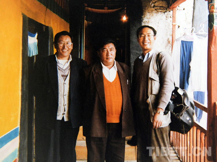 這是唐召明(右)與時(shí)任西藏自治區(qū)政協(xié)副主席、孝登寺寺主珠康活佛(中)在孝登寺合影留念(桑吉扎西1998年攝)