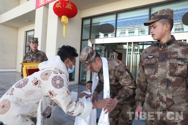 圖為兒童家長(zhǎng)為官兵獻(xiàn)上哈達(dá)