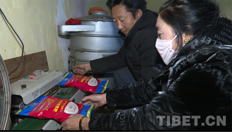 圖為波科村黨支部書記洛松沙登與大家為水磨糌粑包裝袋封口
