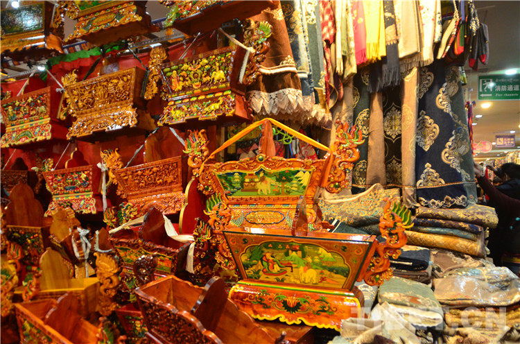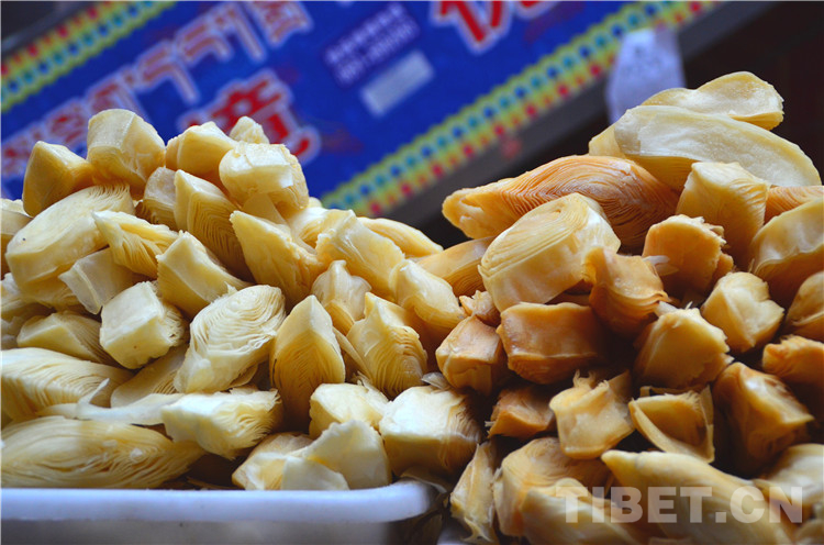 商城一層是一個年貨市場,一層一層壘起來的切瑪盒、不同顏色和形狀的卡塞、堆成寶塔形狀的紅糖、花盆里裝著的青稞苗……在那拿出皮尺量的,是在購買香布,藏歷新年到來時家家戶戶都會更換新的香布。