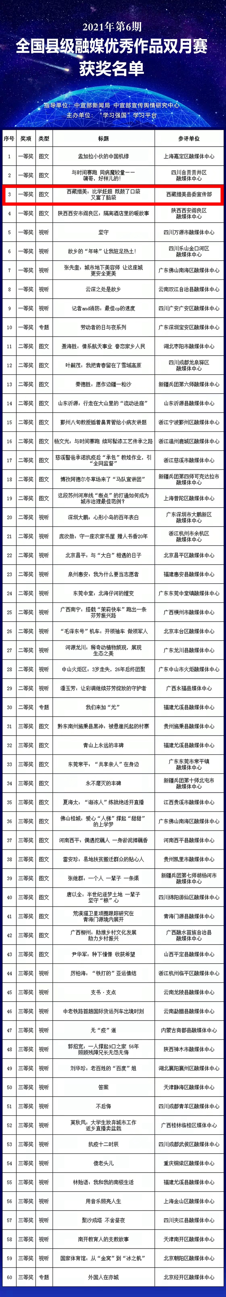 據(jù)了解,2021年第6期全國縣級(jí)融媒體中心優(yōu)秀作品雙月賽由中宣部新聞局、中宣部宣傳輿情研究中心指導(dǎo),“學(xué)習(xí)強(qiáng)國”學(xué)習(xí)平臺(tái)主辦,各?。▍^(qū)、市)和新疆生產(chǎn)建設(shè)兵團(tuán)學(xué)習(xí)平臺(tái)協(xié)助組織、共同實(shí)施,各省級(jí)學(xué)習(xí)平臺(tái)對(duì)投稿作品進(jìn)行初評(píng),評(píng)選出299件優(yōu)秀作品,“學(xué)習(xí)強(qiáng)國”學(xué)習(xí)平臺(tái)組織專家評(píng)審團(tuán)隊(duì)對(duì)優(yōu)秀作品進(jìn)行復(fù)評(píng)、終評(píng),最終評(píng)選出60件獲獎(jiǎng)作品。