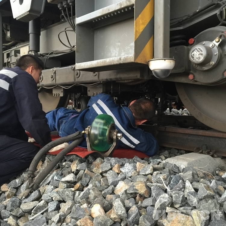 即將達(dá)到加查站時(shí),探傷員余賢明發(fā)現(xiàn)探傷車左側(cè)第2個(gè)探輪有破損現(xiàn)象,需要更換探輪,大家立刻按照分工各就各位。隊(duì)長聯(lián)系集團(tuán)公司調(diào)度、加查站安排探傷車??寇囌荆O(shè)置好防護(hù)后,李生紅和余賢明立即鉆到車下拆卸破損探輪,崔成剛和李慧臣則準(zhǔn)備好新的探輪。四個(gè)人分工協(xié)作,在夜幕降臨之前將新的探輪安裝了上去。