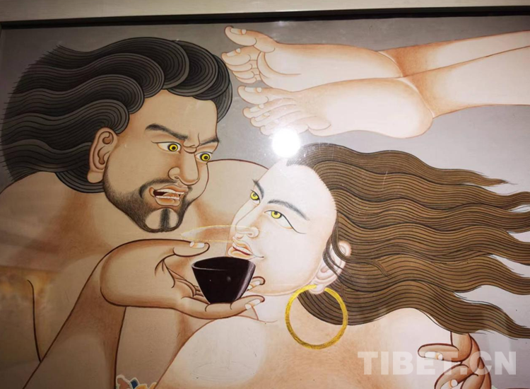 畫展特別展出了邊巴旺堆人物風情“四季”,以傳統(tǒng)的欽孜派唐卡藝術繪畫表達了春夏秋冬自然民俗風情,并以刻畫人物為個性特征,表達人一生經(jīng)歷的生老病死。視覺的沖擊力讓繪畫作品更具藝術感染力,表現(xiàn)了高原人對大自然和生命的祟敬?!版?zhèn)魔圖”作品以西藏“鎮(zhèn)魔圖”傳說為繪畫基礎進行了探索性創(chuàng)作,通過四幅作品顯現(xiàn)西藏幾十年來這片高天厚土發(fā)生的翻天覆地的變化,也表達了藏傳佛教健康發(fā)展的愿望,繪畫作品在藝術手法上,色彩厚重絢麗,濃郁的傳統(tǒng)和現(xiàn)代繪畫完美融合,作品對末來充滿了想象,給每位觀眾帶來不同的藝術享受。作品“三毒”繪畫藝術創(chuàng)作,通過藝術繪畫作品直觀、具體、形象地批判社會發(fā)展中的不雅享樂追求。三組11幅邊巴旺堆階段性的代表作品,不同的傳統(tǒng)繪畫形式展示了欽孜派唐卡藝術之美。