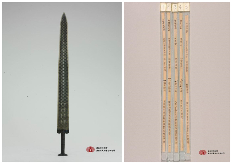 圖為湖北省博物館的兩件鎮(zhèn)館之寶:左為歷經(jīng)2500余年依然寒光閃閃、毫無銹蝕的“天下第一劍”——越王勾踐劍,右為云夢睡虎地秦簡 圖片來源:湖北省博物館網(wǎng)站