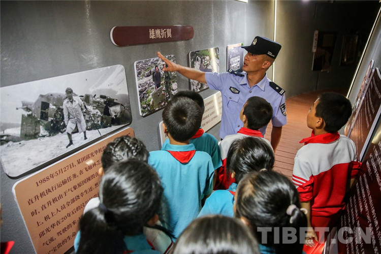 圖為背崩邊境派出所民警在戰(zhàn)斗坑道教育長(zhǎng)廊中向?qū)W生介紹墨脫邊境發(fā)展歷史