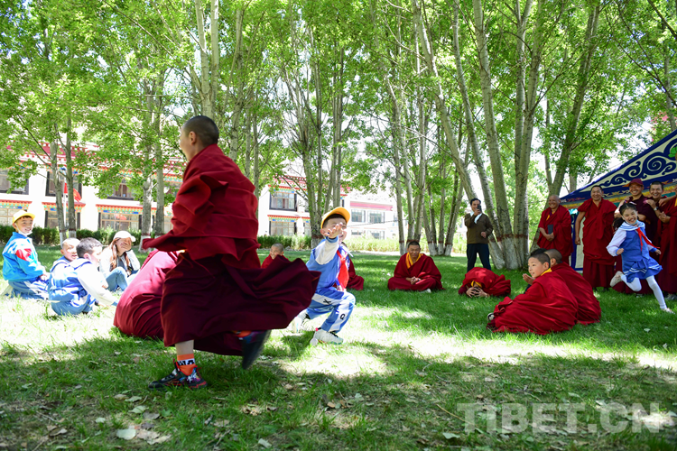 活動中,少年活佛班的學員與拉薩市第一小學的學生代表互動聯歡。少年活佛用藏、漢、英三語向大家自我介紹,朗讀自己的作文,展示了藏文書法作品。拉薩市第一小學的學生們?yōu)樯倌昊罘鹦W班表演了歌舞節(jié)目。大家載歌載舞、喜悅幸福,共度“六一”國際兒童節(jié)。