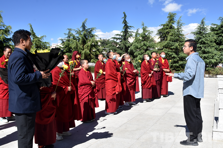 圖為佛學院老師代表相關單位向少年活佛贈送節(jié)日禮物 攝影:拉姆