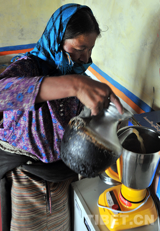 這是班戈縣新吉鄉(xiāng)術(shù)后的斯求卓瑪向放入酥油的電動攪拌壺里倒茶水,準(zhǔn)備用電來打制酥油茶(唐召明2015年7月14日攝)