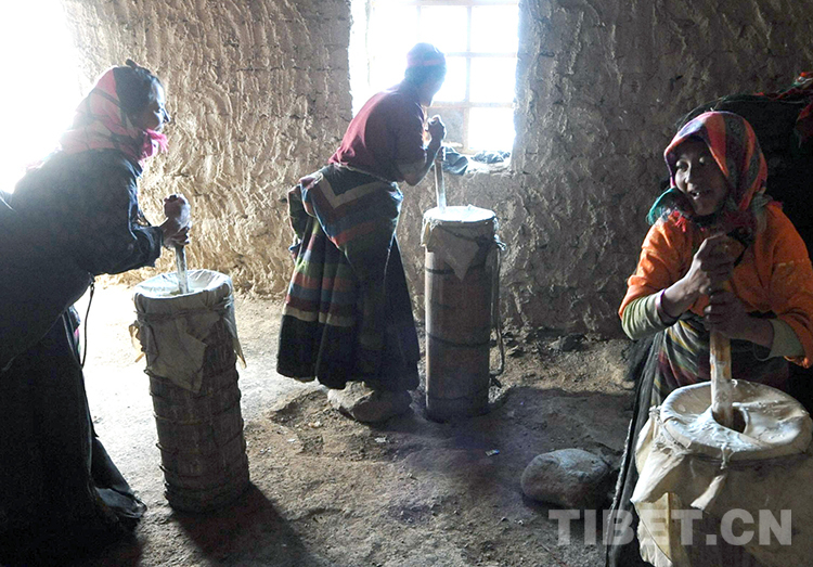 這是申扎縣申扎鎮(zhèn)三村專業(yè)合作經(jīng)濟組織的牧女,在使用傳統(tǒng)酥油桶打制酥油(唐召明2009年攝)
