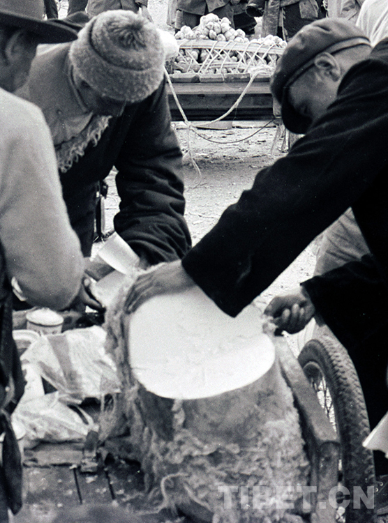 這是在藏北首府那曲鎮(zhèn)市場上,正在售賣的大坨酥油(唐召明1989年攝)