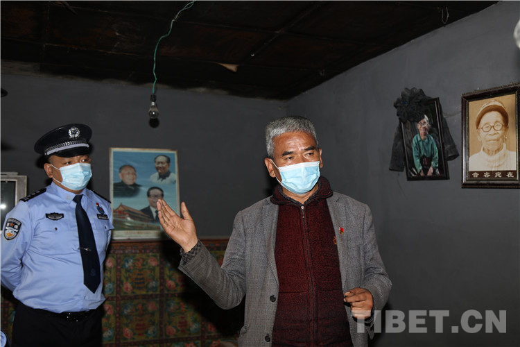 圖為邦村村長(zhǎng)羅布在老阿媽故居向邊檢站民警講述國(guó)旗老阿媽事跡 攝影:尼瑪?shù)┰?/p>