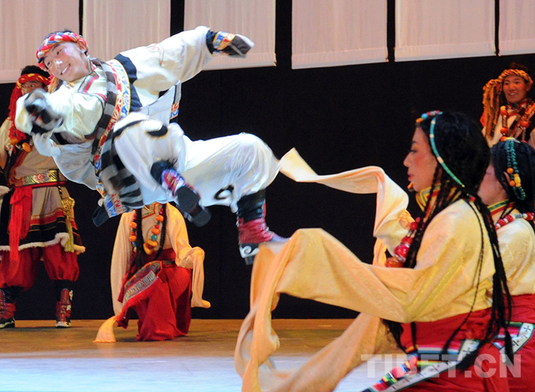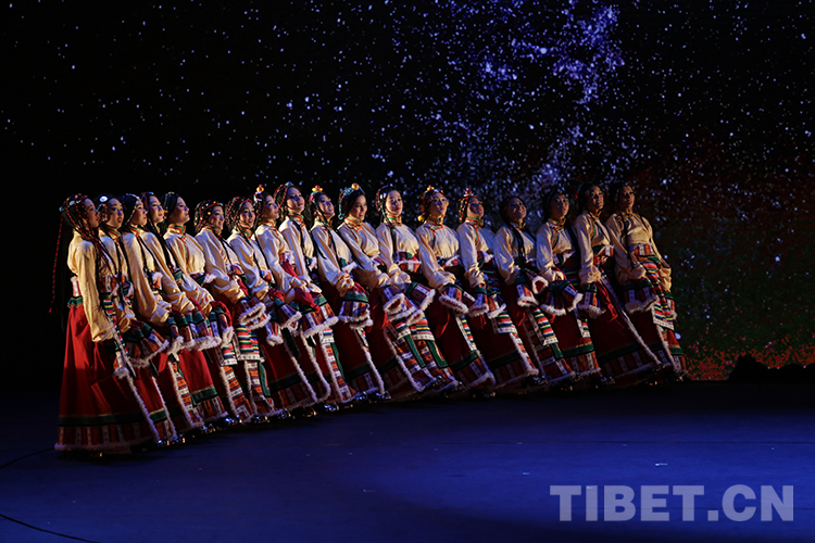 這是班戈縣諧欽民間藝術(shù)團(tuán)的年輕舞蹈演員在北京國家大劇院演出時(shí)的劇照(唐召明2015年10月13日攝)
