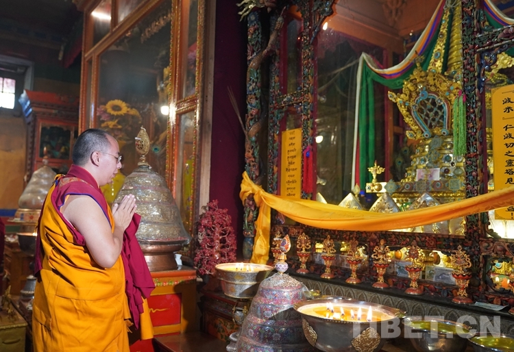 圖為班禪在羊堅(jiān)多康殿波米仁波切靈塔前誦經(jīng)祈禱 攝影:王淑
