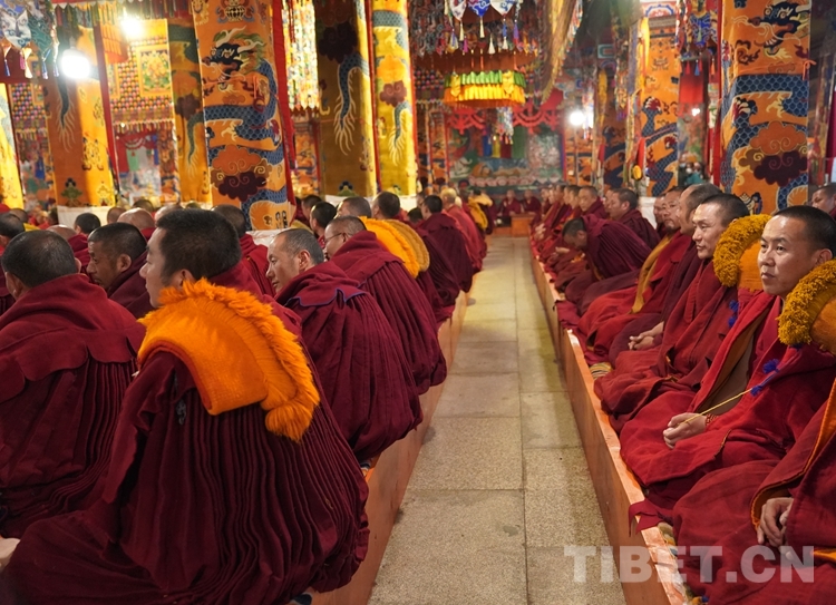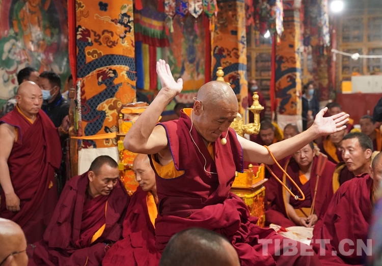 朝拜結(jié)束后,班禪步入甘丹寺夏孜扎倉(cāng),現(xiàn)場(chǎng)觀摩2023年度西藏自治區(qū)藏傳佛教學(xué)經(jīng)僧人晉升格西拉讓巴學(xué)位夏季預(yù)考活動(dòng)。