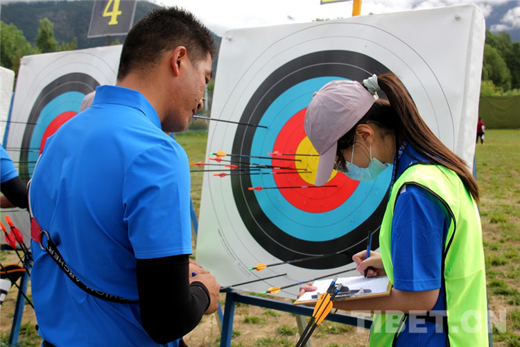 圖為7月29日,一名選手在男子個人70米雙輪賽現(xiàn)場標記箭孔 攝影:德吉卓嘎